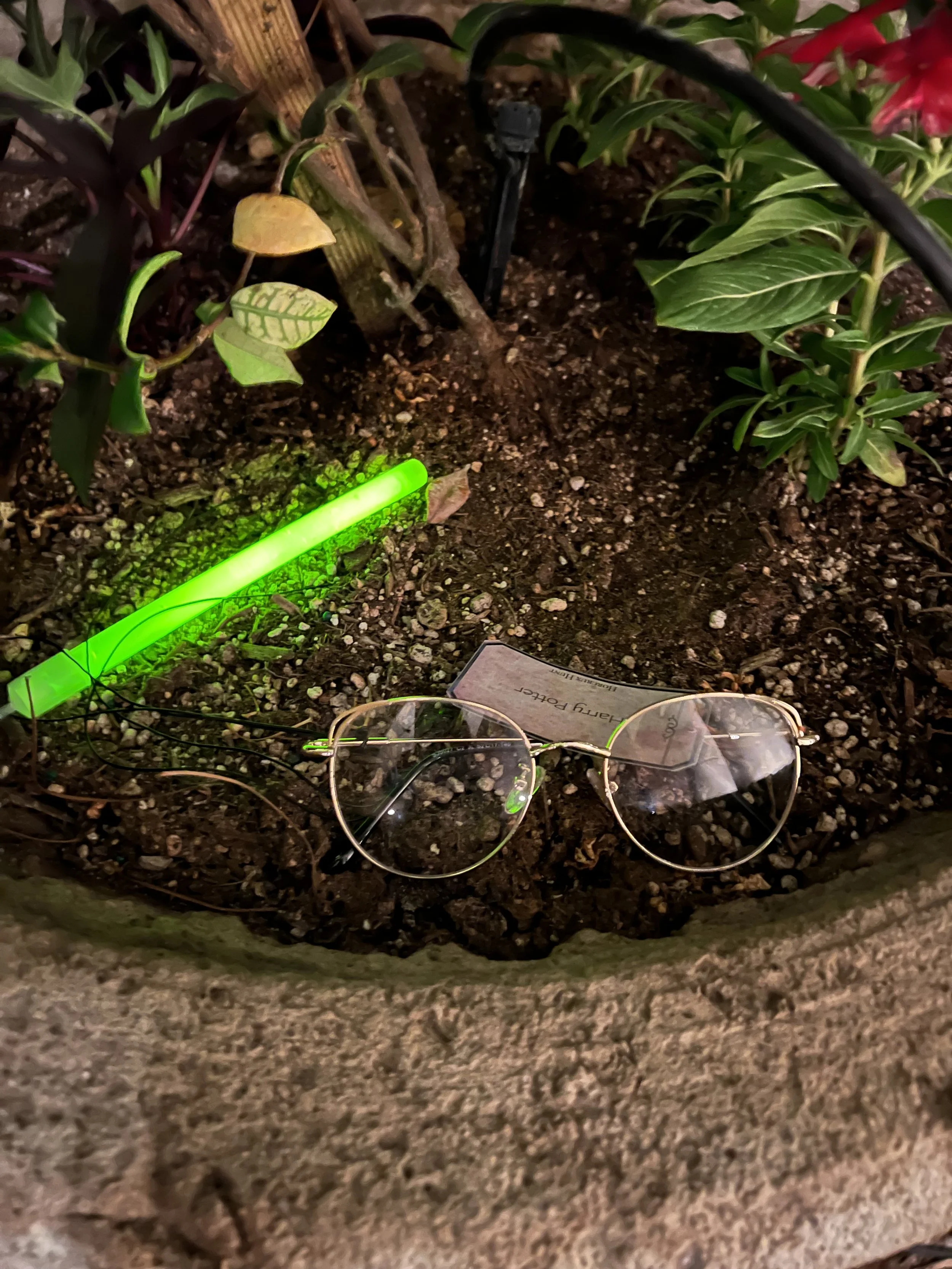 Harry Potter - Since I obviously wasn’t going to hide a whole-ass-boy-who-lived, I opted for just a pair of glasses and hid them in “The Forbidden Forrest,” aka the backyard. Another object I hid with a glowstick!