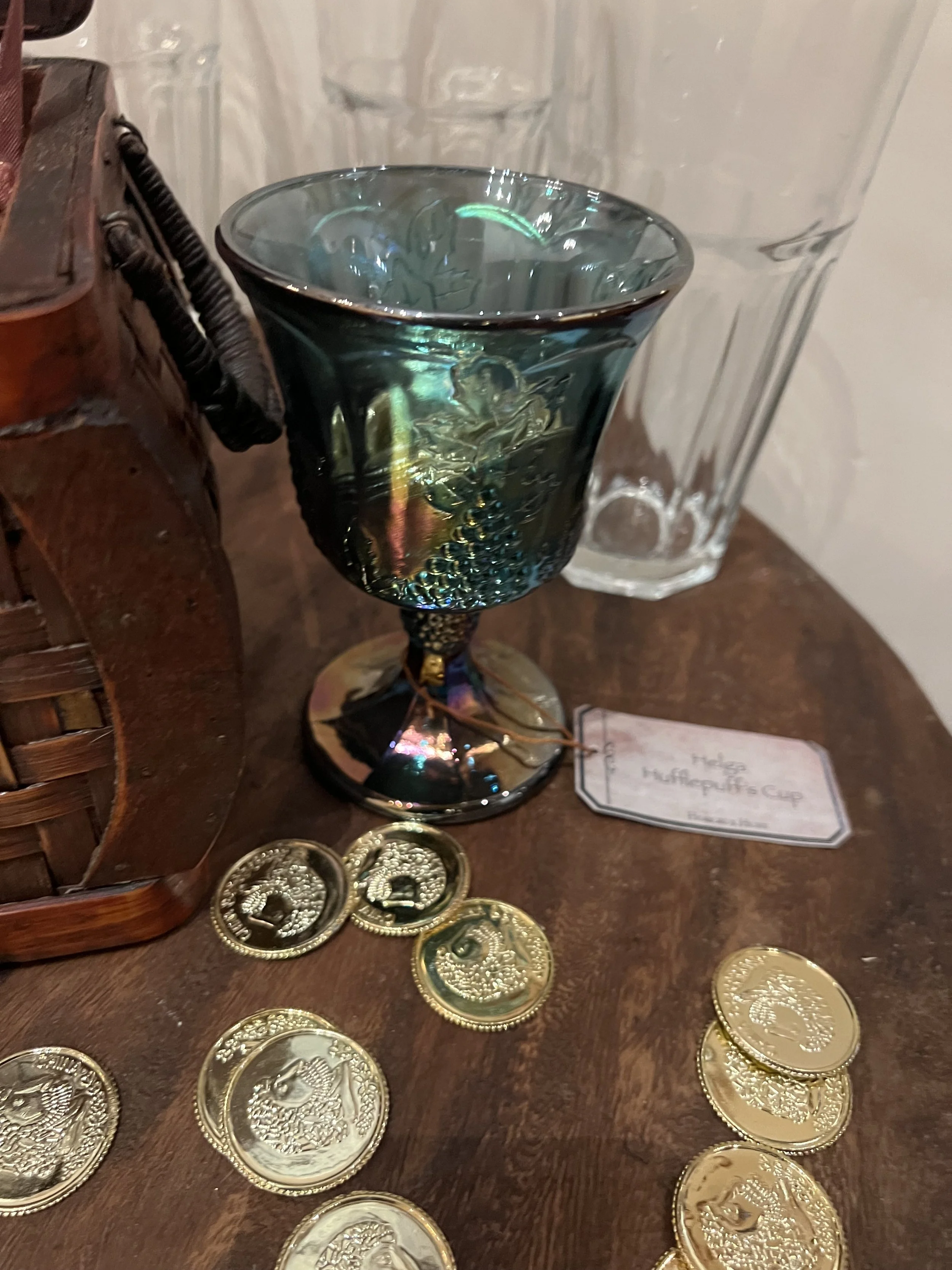 Helga Hufflepuff’s Cup - I used a an antique punch goblet my mom received from her grandmother! I had a Gringott’s bank setup I used as our point keeping system and “hid” the cup here!