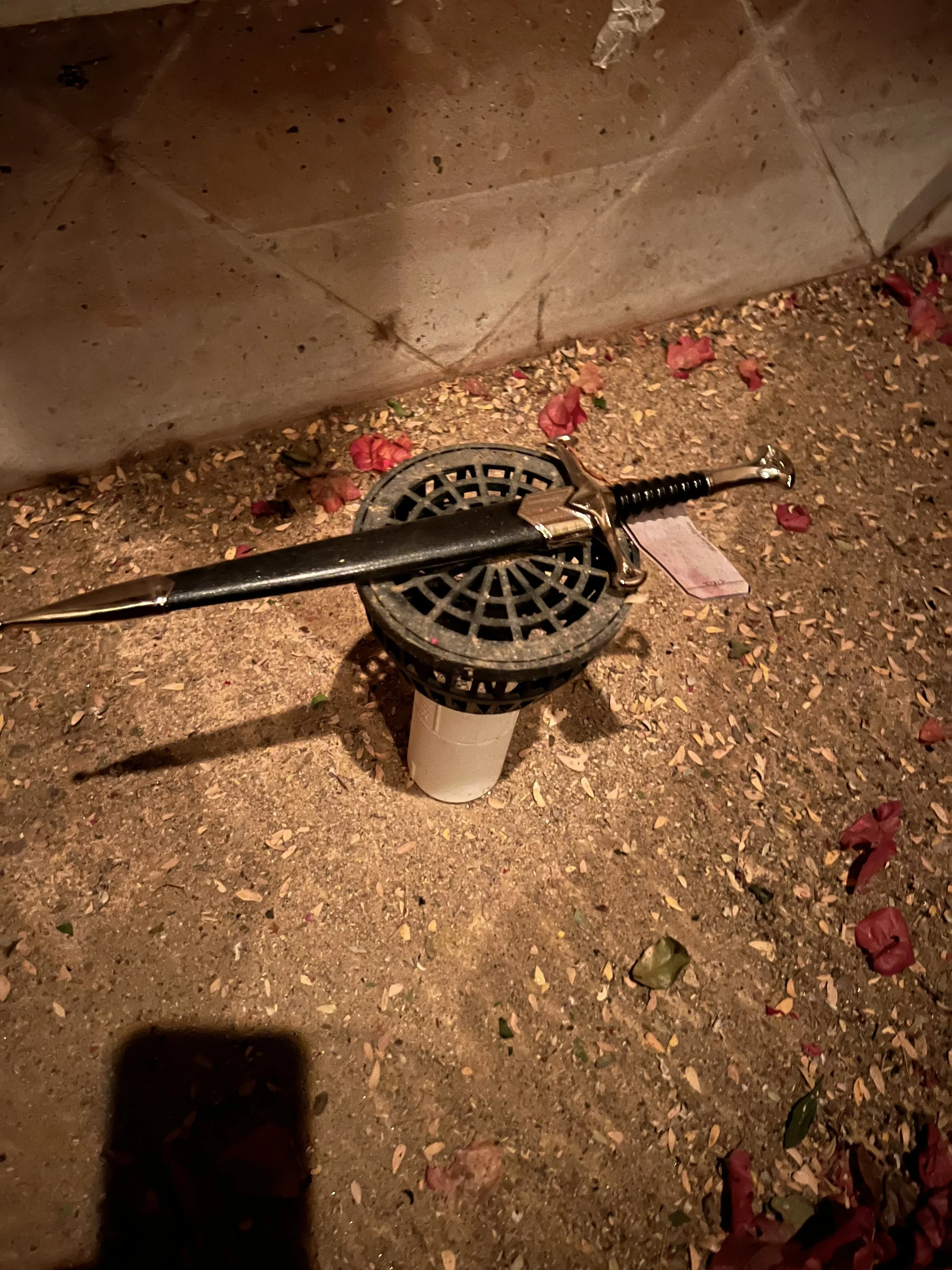 Sword of Godric Gryffandor - I used a really cool knife (or letter opener? I’m not sure, I found it on Amazon lol). I hid this in “The Frozen Lake” aka the bottom of a fountain that also happened to also have a giant Lion’s head on it, so it made for the perfect hiding spot!
