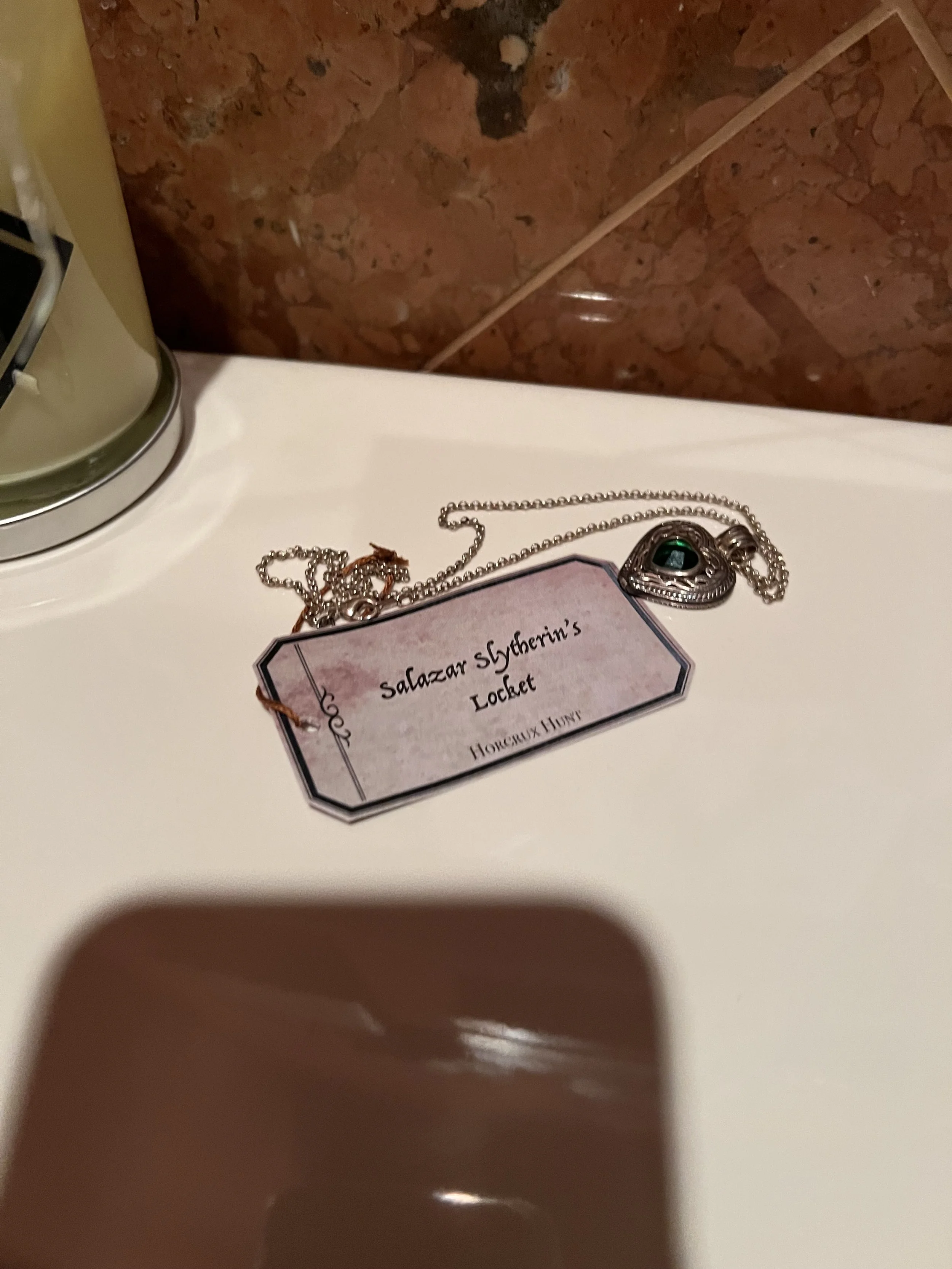 Salazar Slytherin’s Locket - I used a locket of my own that wasnt exactly antique or antique-looking lol. But it did happen to have a green stone so its as close as I could get. The label made it obvious what it was anyhow… I hid this in one of the bathrooms on top of the toilet tank where I posted a “this way to the Ministry of Magic” sign.